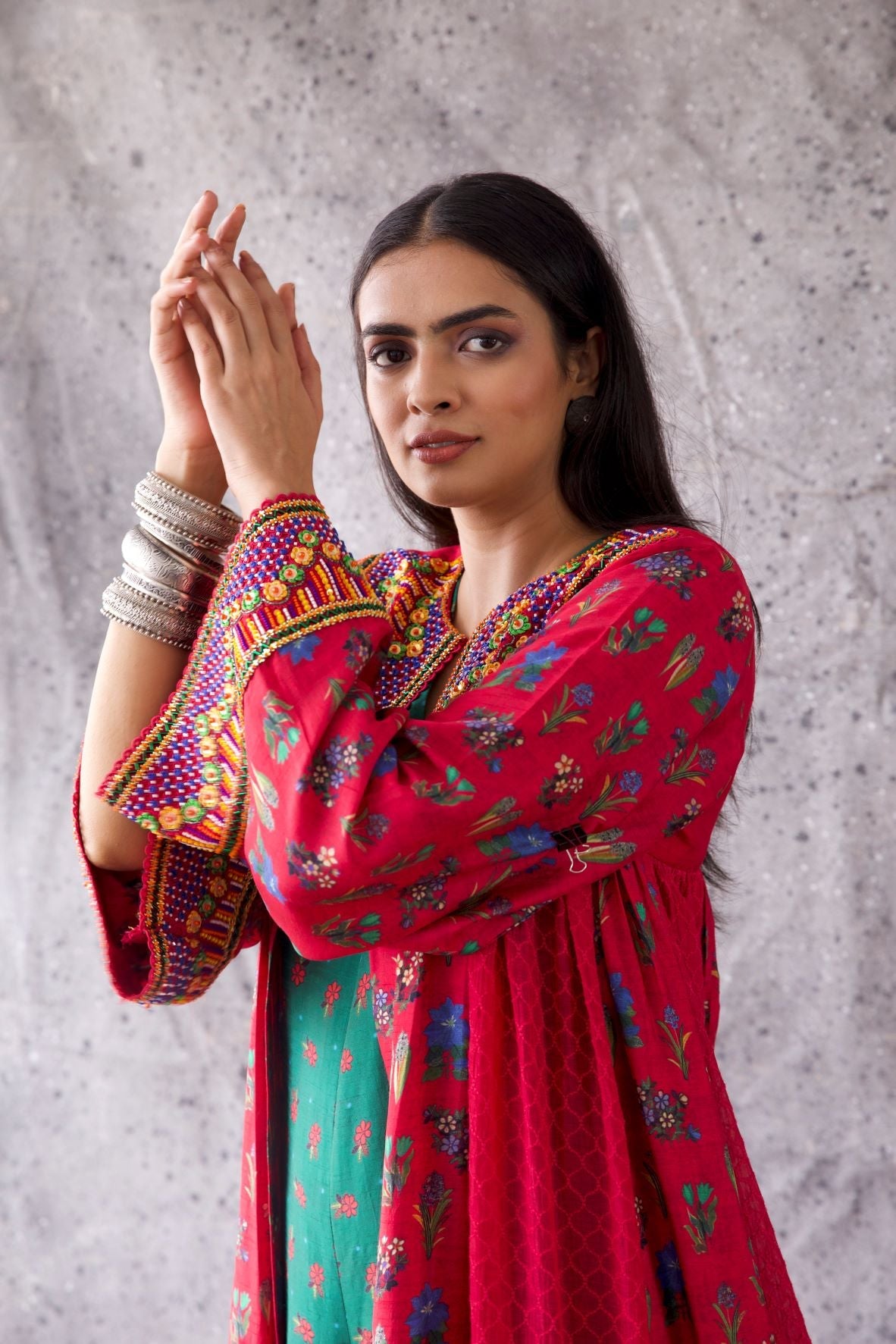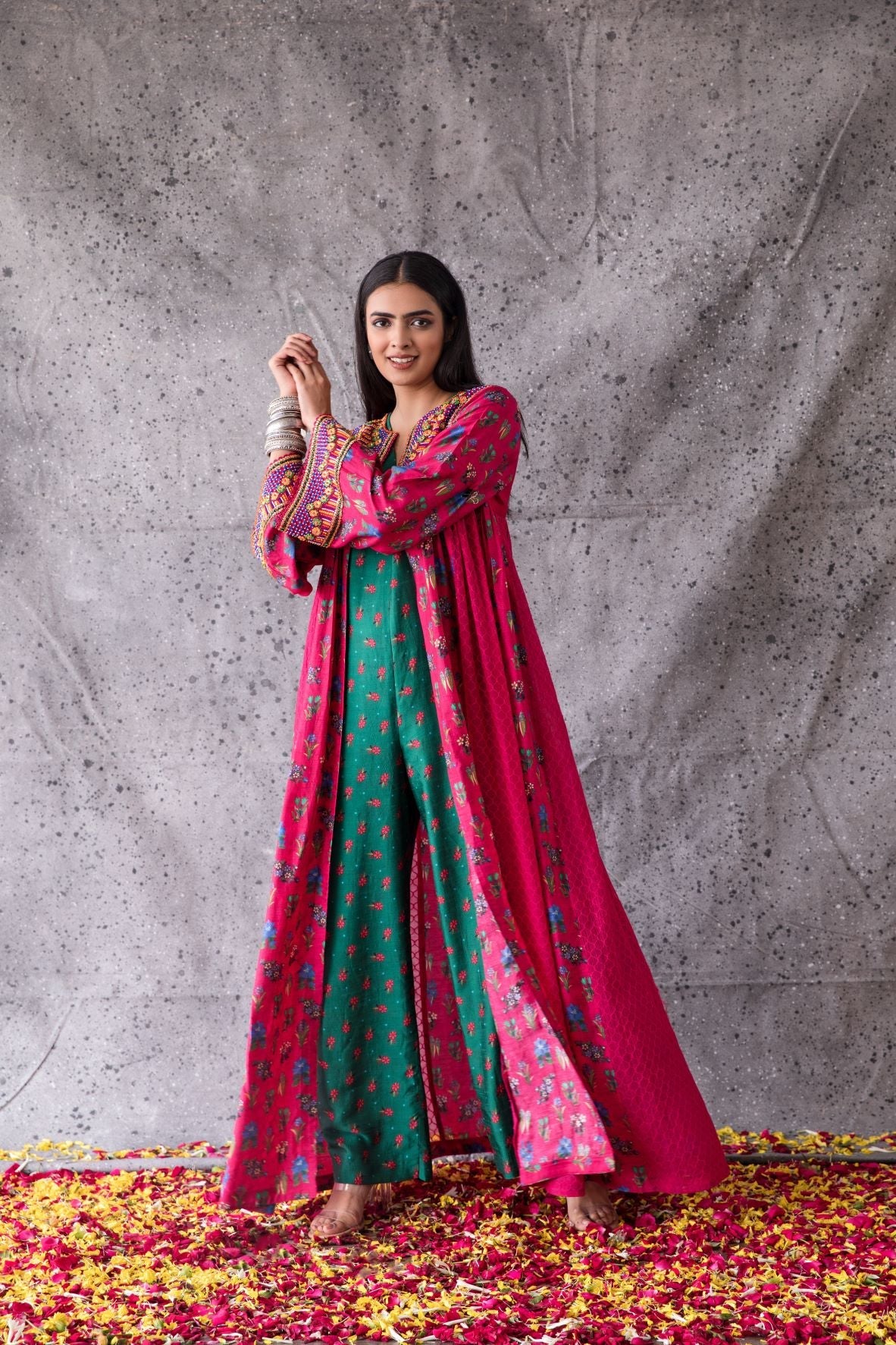 Featuring a Pink Jacket in a dupion base with a floral print. The Jacket is made in kali with gathers. On the chest and sleeves, we have used resham, sequence and bead hand embroidery. It comes along with a green floral print jumpsuit.