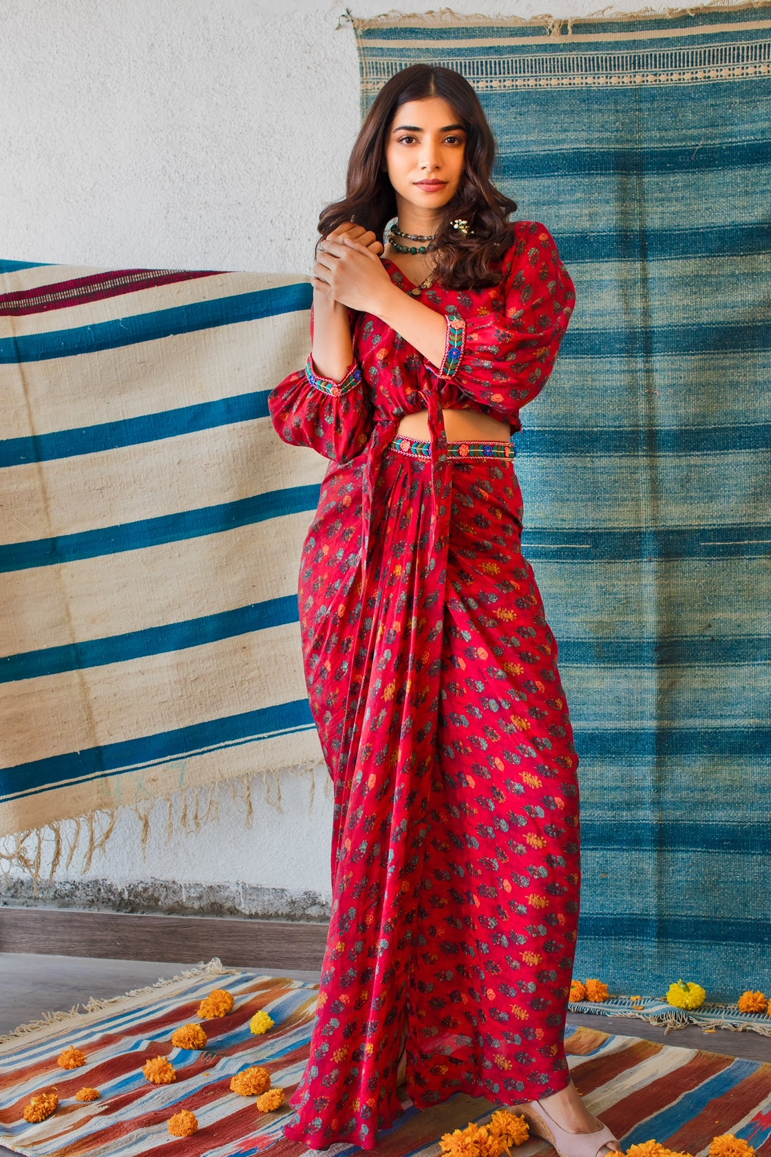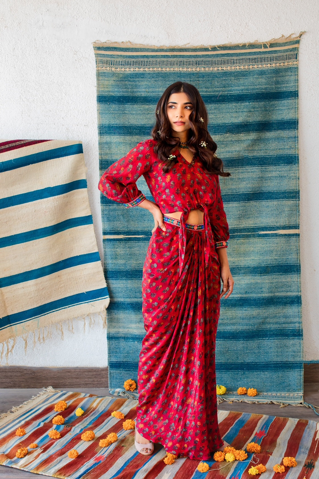 Featuring a red top and skirt in dupion silk fabric. The skirt has pleats on the waist. The embroidery on the skirt waist and sleeves is Resham hand embroidery.